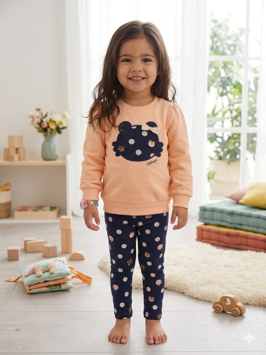 A legging complementa o conjunto com uma estampa moderna de poás e detalhes fofos, oferecendo elasticidade e liberdade de movimento para brincar com conforto.