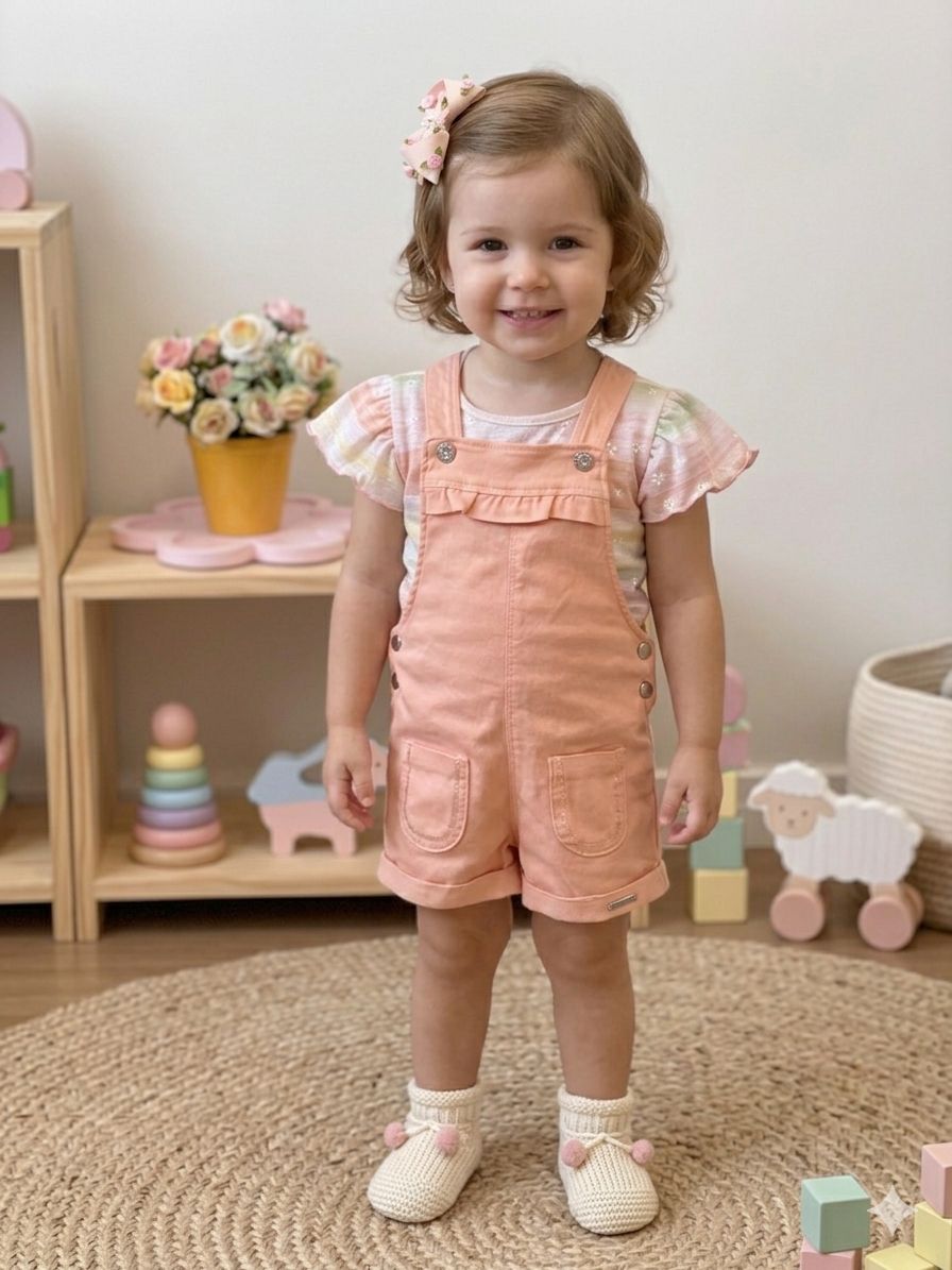 A jardineira em tom pêssego traz um design clássico com toque fashion, contando com alças ajustáveis, botões laterais e lindos bolsos frontais com detalhe sutil que adiciona ainda mais encanto à peça. Confeccionada em tecido macio e confortável, é perfeita para acompanhar a rotina das crianças com leveza e liberdade.